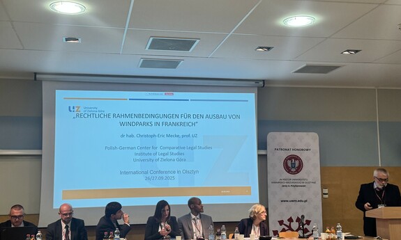 Prof. UZ dr hab. Christoph-Eric Mecke przedstawił referat pt. „Rechtliche Rahmenbedingungen für den Ausbau von Windparks in Frankreich und Belgien” („Prawne uwarunkowania dla rozbudowy farm wiatrowych we Francji i Belgii”).