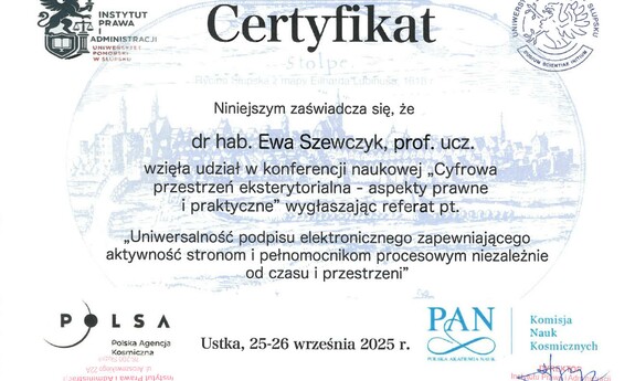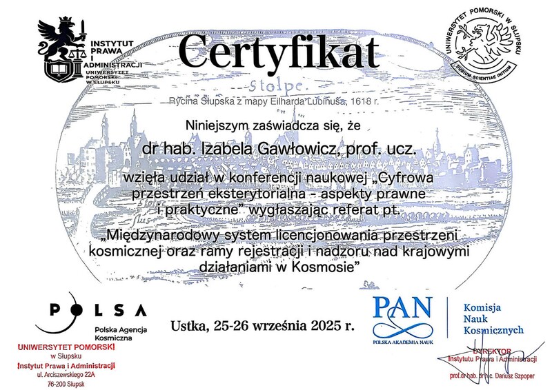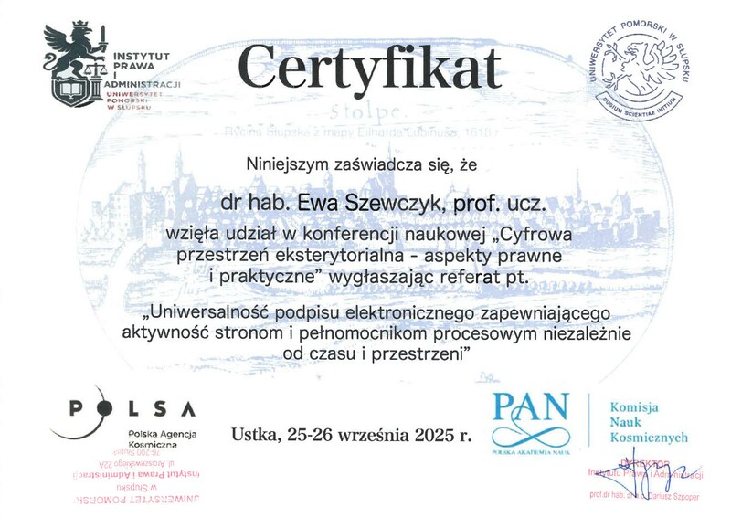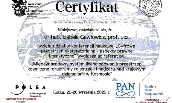 W dniach 25-26 września 2025 r. w Ustce odbyła się konferencja pt. „Cyfrowa przestrzeń eksterytorialna - aspekty prawne i praktyczne”. Organizatorzy konferencji: Instytut Prawa i Administracji Uniwersytetu Pomorskiego w Słupsku oraz Polska Agencja Kosmiczna uzyskali patronat merytoryczny Komisji Nauk Kosmicznych Polskiej Akademii Nauk.