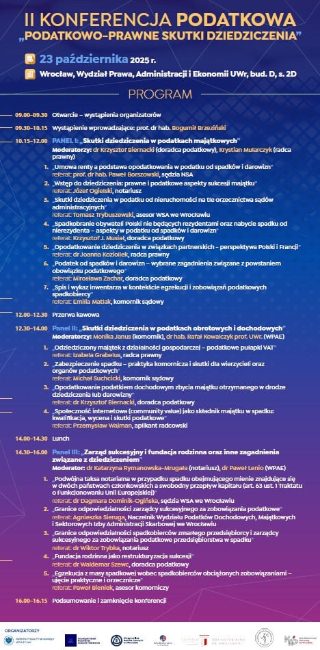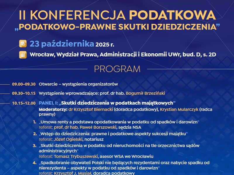 Dnia 23 października 2025 roku w sali 2D budynku D Wydziału Prawa, Administracji i Ekonomii Uniwersytetu Wrocławskiego odbyła się Konferencja Naukowa „Podatkowo-prawne skutki dziedziczenia”. Organizatorami wydarzenia byli Katedra Prawa Finansowego Wydziału Prawa, Administracji i Ekonomii Uniwersytetu Wrocławskiego, Dolnośląski Oddział Krajowej Izby Doradców Podatkowych, Okręgowa Izba Radców Prawnych we Wrocławiu, Izba Komornicza we Wrocławiu i Izba Notarialna we Wrocławiu, Wojewódzki Sąd Administracyjny we Wrocławiu oraz Izba Administracji Skarbowej we Wrocławiu.