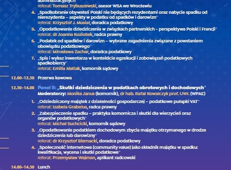 Pan dr Wiktor Trybka wystąpił z referatem „Granice odpowiedzialności spadkobierców zmarłego przedsiębiorcy i zarządcy sukcesyjnego za zobowiązania podatkowe przedsiębiorstwa w spadku”. Referat dr. Wiktora Trybki spotkał się z uznaniem i bardzo dobrym przyjęciem. Nie tylko teoretyczny, ale również aplikacyjny charakter wystąpień wywołały dyskusję nad podniesionymi w referatach kwestiami. W tym wydarzeniu naukowym dr Wiktor Trybka reprezentował Izbę Notarialną we Wrocławiu, a bezpośrednim inicjatorem jego wystąpienia była Pani Prezes Izby Notarialnej we Wrocławiu notariusz Jolanta Ołpińska.