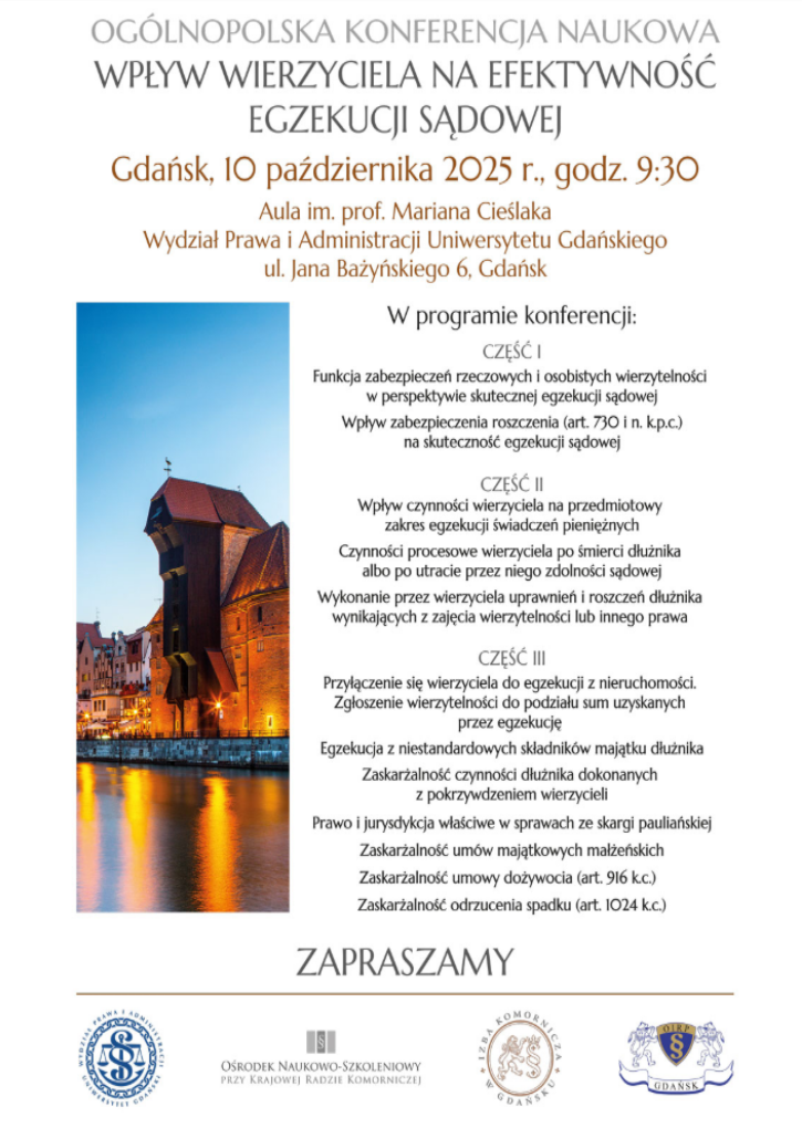 W dniu 10 października 2025 r. Pan dr Zbigniew Woźniak brak udział w konferencji naukowej organizowanej przez Wydział Prawa i Administracji Uniwersytetu Gdańskiego we współpracy z Izbą Komorniczą w Gdańsku oraz Okręgową Izbą Radców Prawnych w Gdańsku. Tematem przewodniczym konferencji był „Wpływ wierzyciela na efektywności egzekucji sądowej” w ramach którego doktor Zbigniew Woźniak wygłosił referat na temat „Wpływ zabezpieczenia roszczenia (art. 730 i.n. k.p.c.) na skuteczność egzekucji sądowej. Jednym z wielu postulatów zawartych w referacie była potrzeba uchylenia przesłanki interesu prawnego w udzieleniu zabezpieczenia oraz zastąpienia hipoteki przymusowej jako sposobu zabezpieczenia zakazem rozporządzenia nieruchomością.